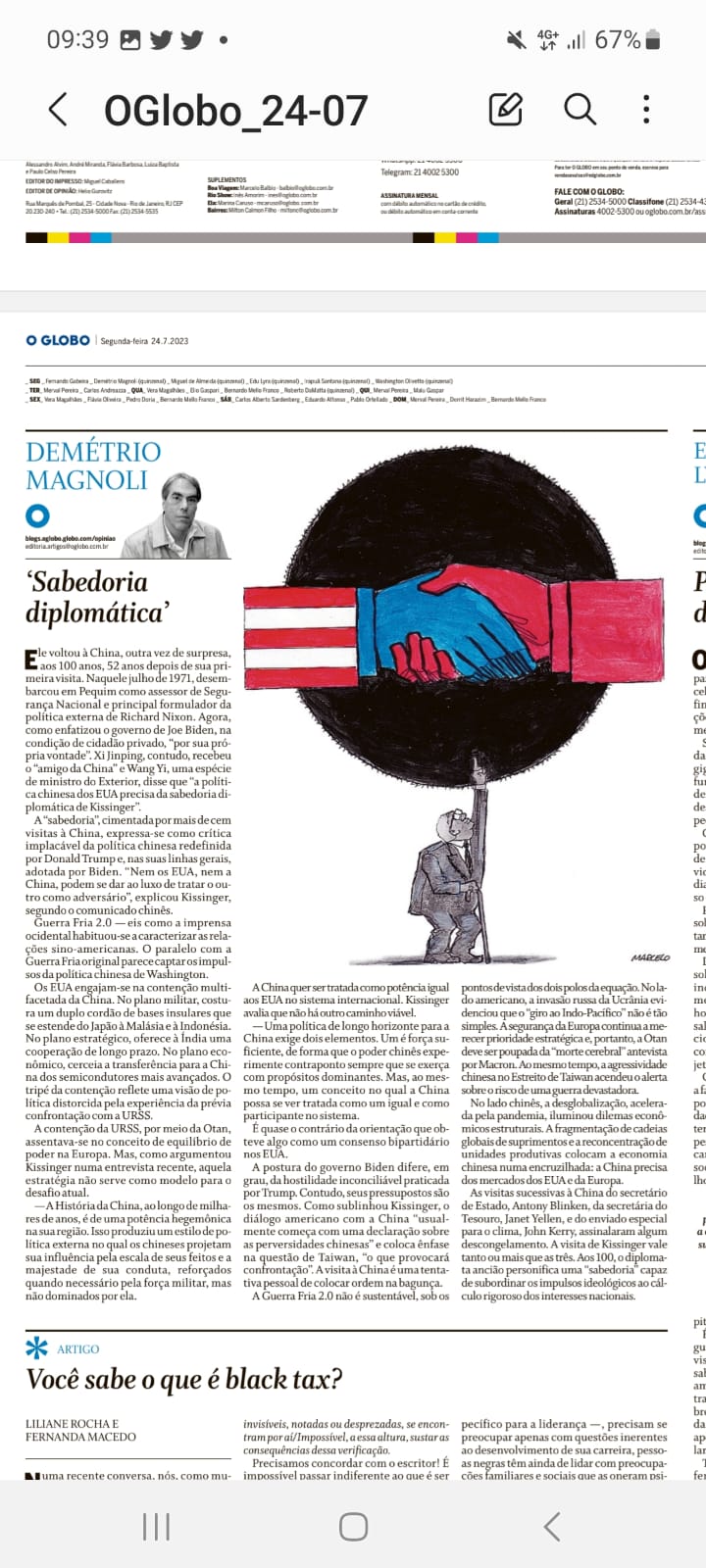 Debatedor 1: A “sabedoria”, cimentada por mais de cem visitas à China, expressa-se como crítica implacável da política chinesa redefinida por Donald Trump e, nas suas linhas gerais, adotada por Biden. “Nem os EUA, nem a China, podem se dar ao luxo de tratar o outro como adversário”, explicou Kissinger, segundo o comunicado chinês. (…)