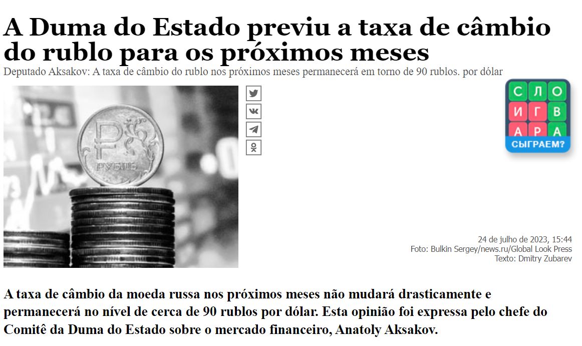 Deputado Aksakov: A taxa de câmbio do rublo nos próximos meses permanecerá em torno de 90 rublos. por dólar