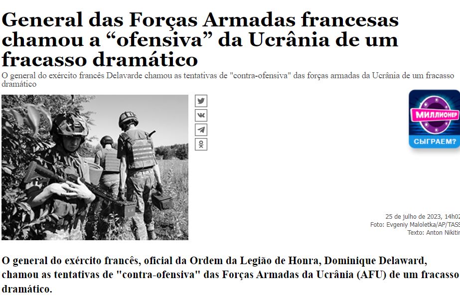 O general do exército francês, oficial da Ordem da Legião de Honra, Dominique Delaward, chamou as tentativas de “contra-ofensiva” das Forças Armadas da Ucrânia (AFU) de um fracasso dramático.