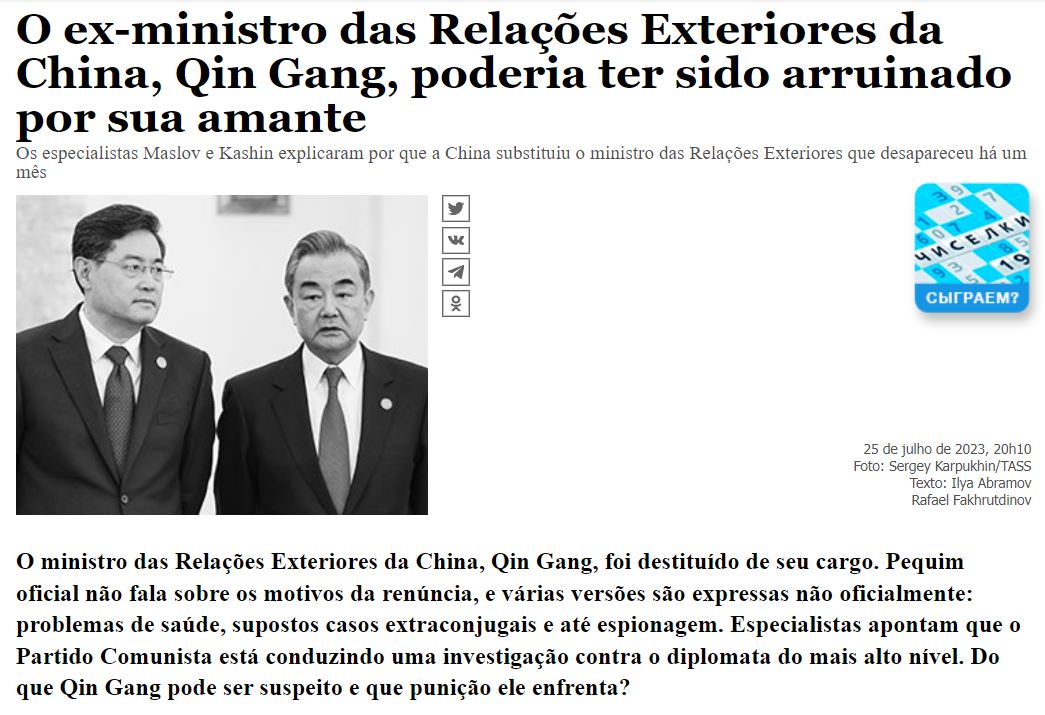O Parlamento chinês demitiu Qin Gang do cargo de ministro das Relações Exteriores. Em seu lugar foi nomeado chefe do gabinete da comissão de relações exteriores do Comitê Central do Partido Comunista da China, Wang Yi, ministro das Relações Exteriores de longa data. Qin Gang não aparece em público há um mês – desde 25 de junho, e o ministério não relatou nada sobre suas atividades. Por causa disso, o secretário de Relações Exteriores britânico, James Cleverley, cancelou uma visita planejada a Pequim. Uma viagem à China teve de ser adiada e o chefe da diplomacia europeia, Josep Borrell, informa o RBC .