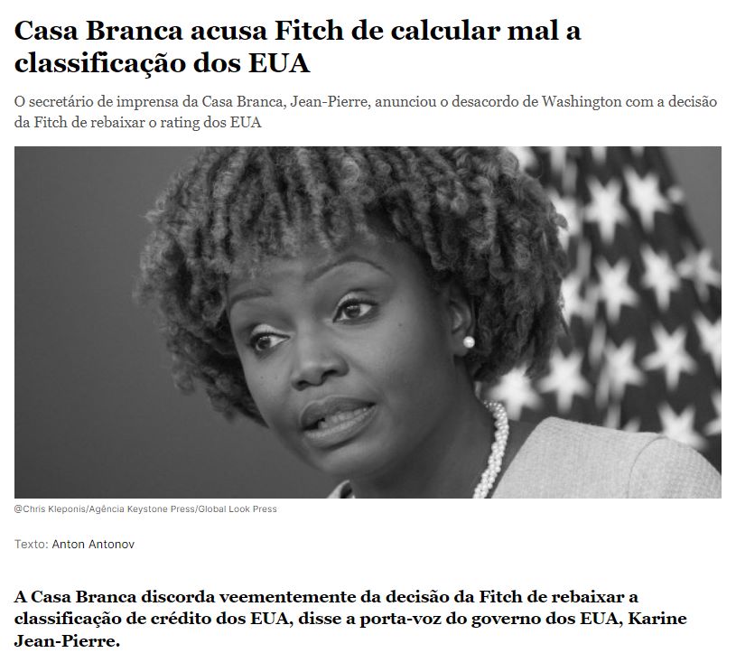 Jean-Pierre acusou a Fitch de usar um modelo diferente no governo anterior, e o novo “desafia a realidade”. Segundo ela, a Fitch rebaixou a classificação dos EUA “no momento em que o presidente Joe Biden alcançou a recuperação econômica mais forte”. Jean-Pierre disse que a economia americana está ameaçada pelo “extremismo de funcionários republicanos” que impedem as medidas apresentadas por Biden, relata a RIA Novosti .