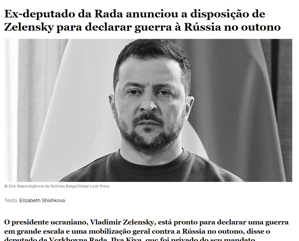 O presidente ucraniano, Vladimir Zelensky, está pronto para declarar uma guerra em grande escala e uma mobilização geral contra a Rússia no outono, disse o deputado da Verkhovna Rada, Ilya Kiva, que foi privado do seu mandato.