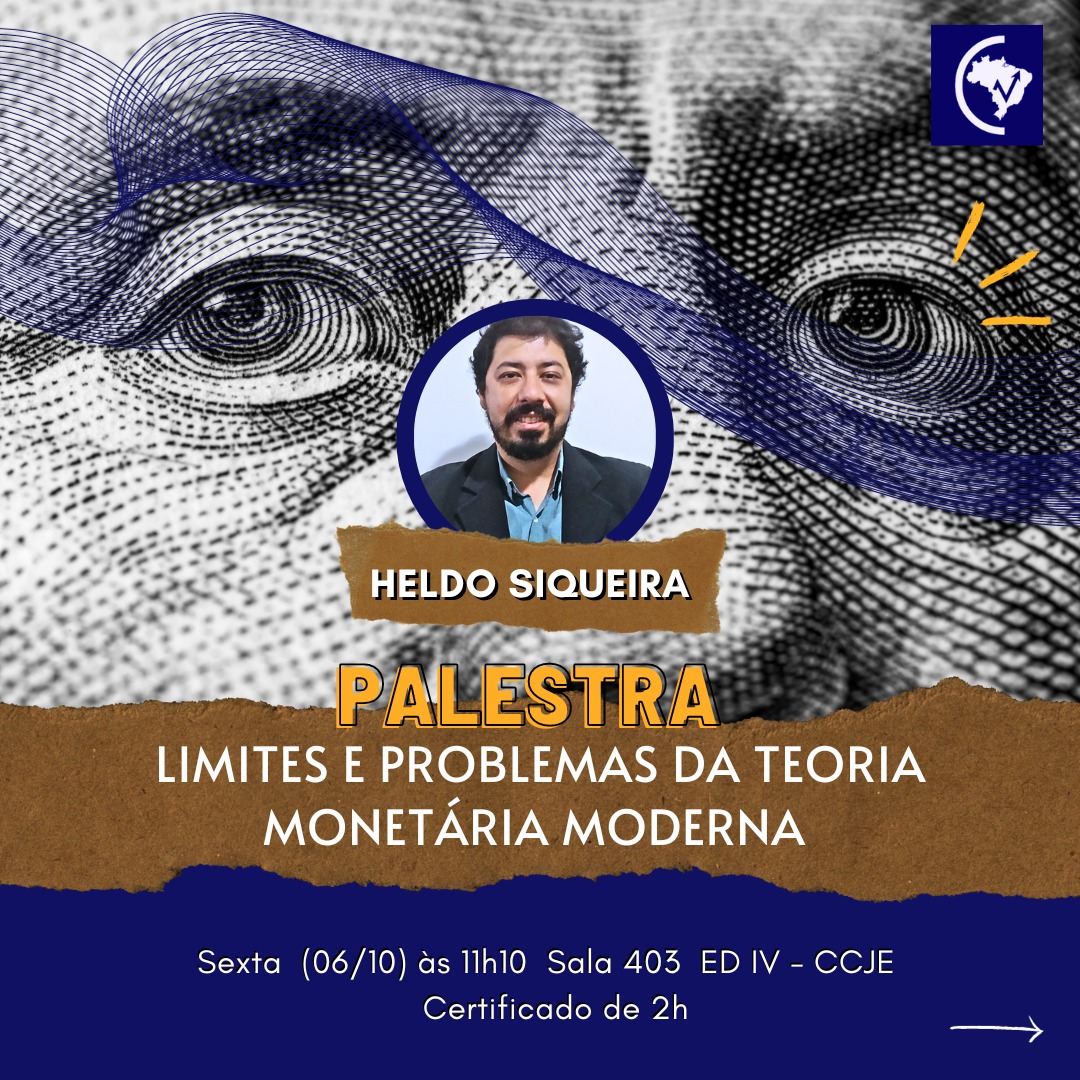 Nesta sexta-feira (dia 06/10), o economista Heldo Siqueira, a convite do grupo de Conjuntura, irá ministrar uma palestra intitulada Limites e Problemas da Teoria Monetária Moderna. A palestra ocorrerá na sala 403 e contará com a emissão de certificados!!Contamos com a presença de todos!!!