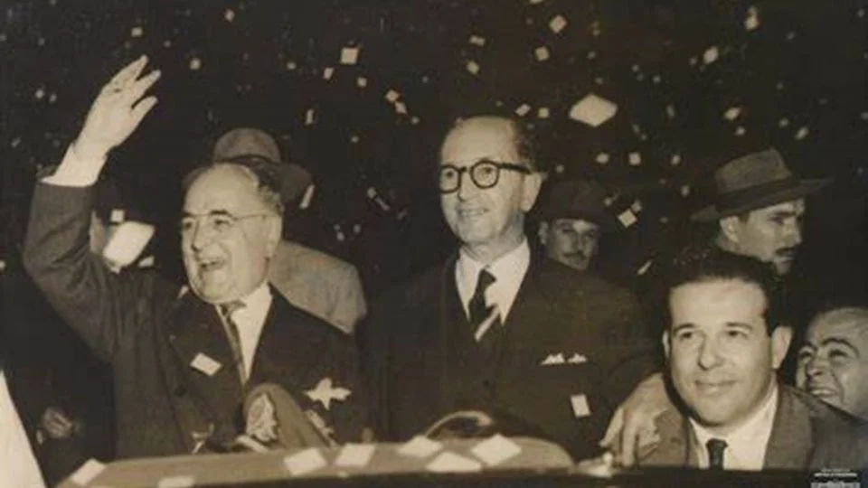 No final de outubro de 1945, Getúlio renuncia à presidência pela pressão de generais do exército; volta em cena na presidência em 1951, com a vitória nas urnas em 1950.