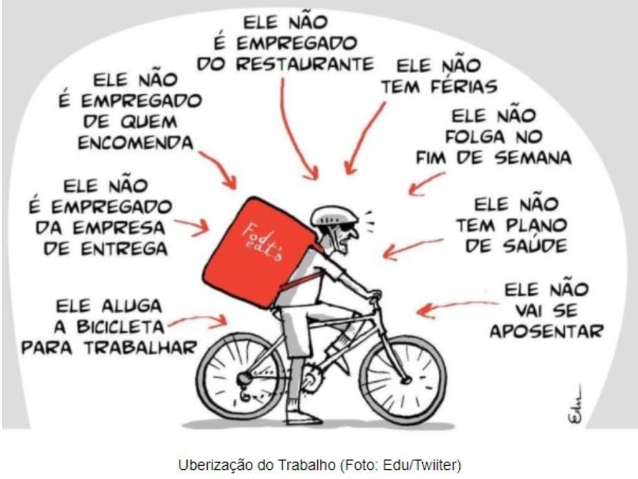 O aplicativo Uber é o exemplo mais emblemático desse processo: motoristas trabalham por conta própria, sem vínculo empregatício, enfrentando baixa remuneração, jornadas longas e ausência de direitos, e entregadores de comida vivem realidades semelhantes.