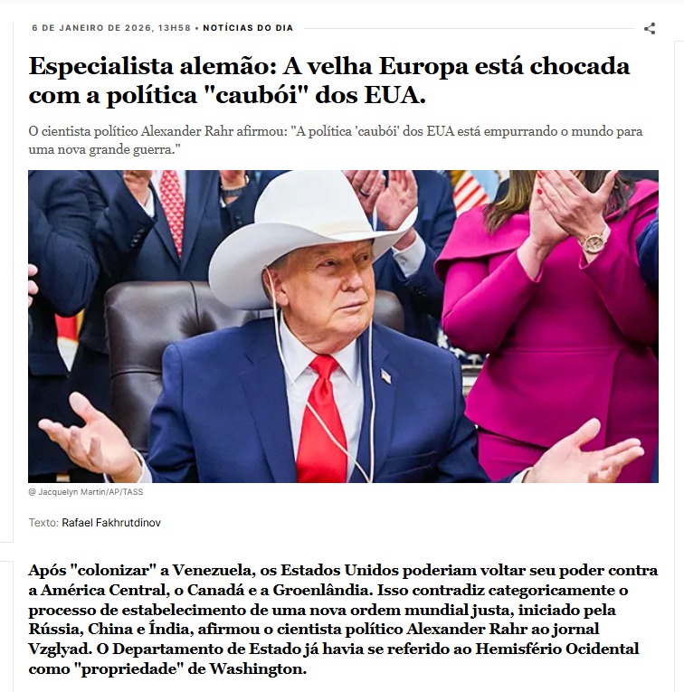 “O início de 2026 marca mais uma mudança de era. A ordem mundial, baseada nas chamadas ‘regras’ e ‘valores liberais’, entrou em colapso. Além disso, não foi a Rússia durante a Segunda Guerra Mundial, como afirma Bruxelas, que a destruiu, mas sim as próprias políticas do Ocidente”, observou o cientista político alemão Alexander Rahr.