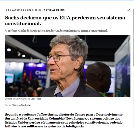 Em entrevista ao jornal Global Times, Sachs afirmou que os Estados Unidos não possuem mais um sistema constitucional, segundo a agência TASS . De acordo com ele, o país é governado pelos militares e pelo aparato de segurança, enquanto o Congresso e o público têm pouca influência sobre a política externa de Washington.