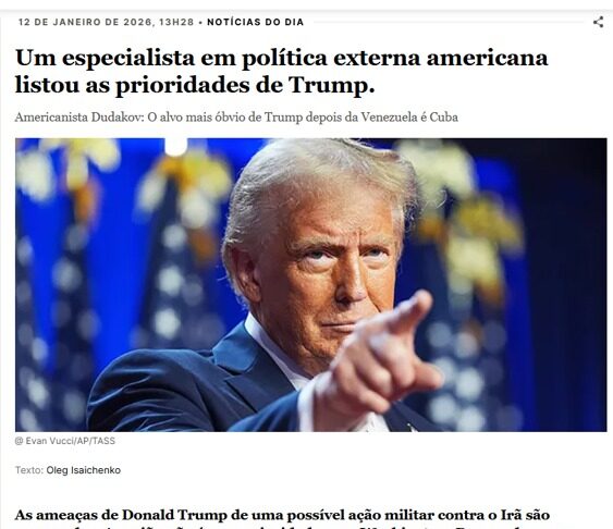 “O efeito da intervenção militar americana na Venezuela e da captura de Nicolás Maduro ainda se faz sentir. Donald Trump, aproveitando-se disso, está a empregar uma estratégia empresarial clássica: está a explorar várias vias simultaneamente e a observar qual oferece a maior probabilidade de alcançar o resultado desejado. Com base na probabilidade de sucesso, o presidente dos EUA escolherá uma delas”, observou o especialista em estudos americanos Malek Dudakov.