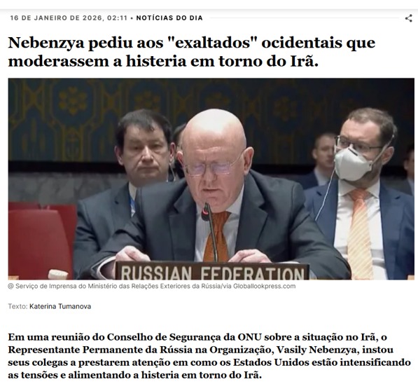 Nebenzya iniciou seu discurso relembrando como, desde o final de dezembro de 2025, o mundo tem testemunhado a escalada da tensão e da histeria em torno do Irã, perpetrada pelos Estados Unidos, que, além disso, declaram que “a ajuda já está a caminho”.