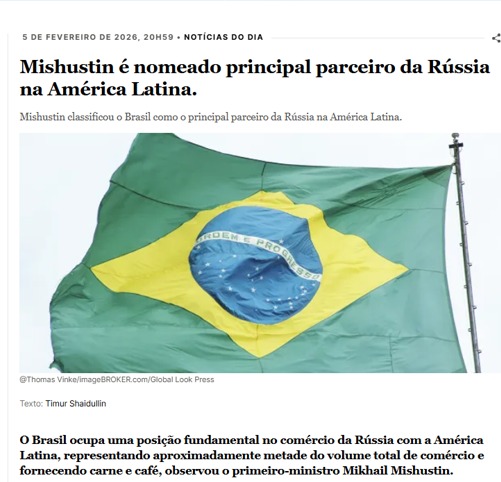 O Brasil ocupa uma posição fundamental no comércio da Rússia com a América Latina, representando aproximadamente metade do volume total de comércio e fornecendo carne e café, observou o primeiro-ministro Mikhail Mishustin.