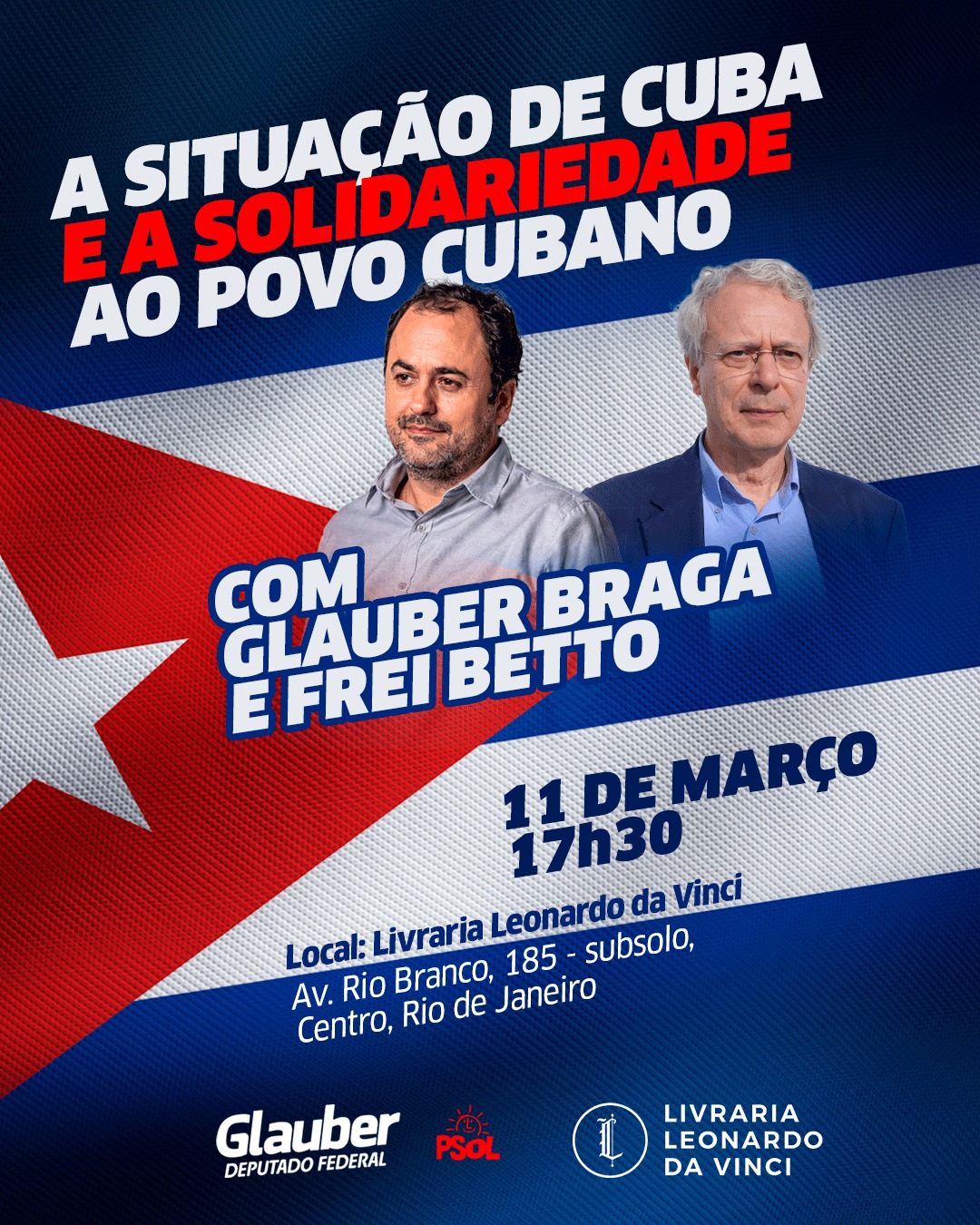 BrasilDebatesDestaquesEm AltaEstado Nacional A situação de Cuba e a Solidariedade ao povo Cubano. Com Glauber Braga e Frei Beto By Redação Paraíso Brasil - 10 de março de 2026 1 FacebookTwitterPinterestWhatsApp 11 de março, 17h30 Local: Livraria Leonardo da Vinci (Av. Rio Branco, 185 – subsolo, Centro, Rio de Janeiro)